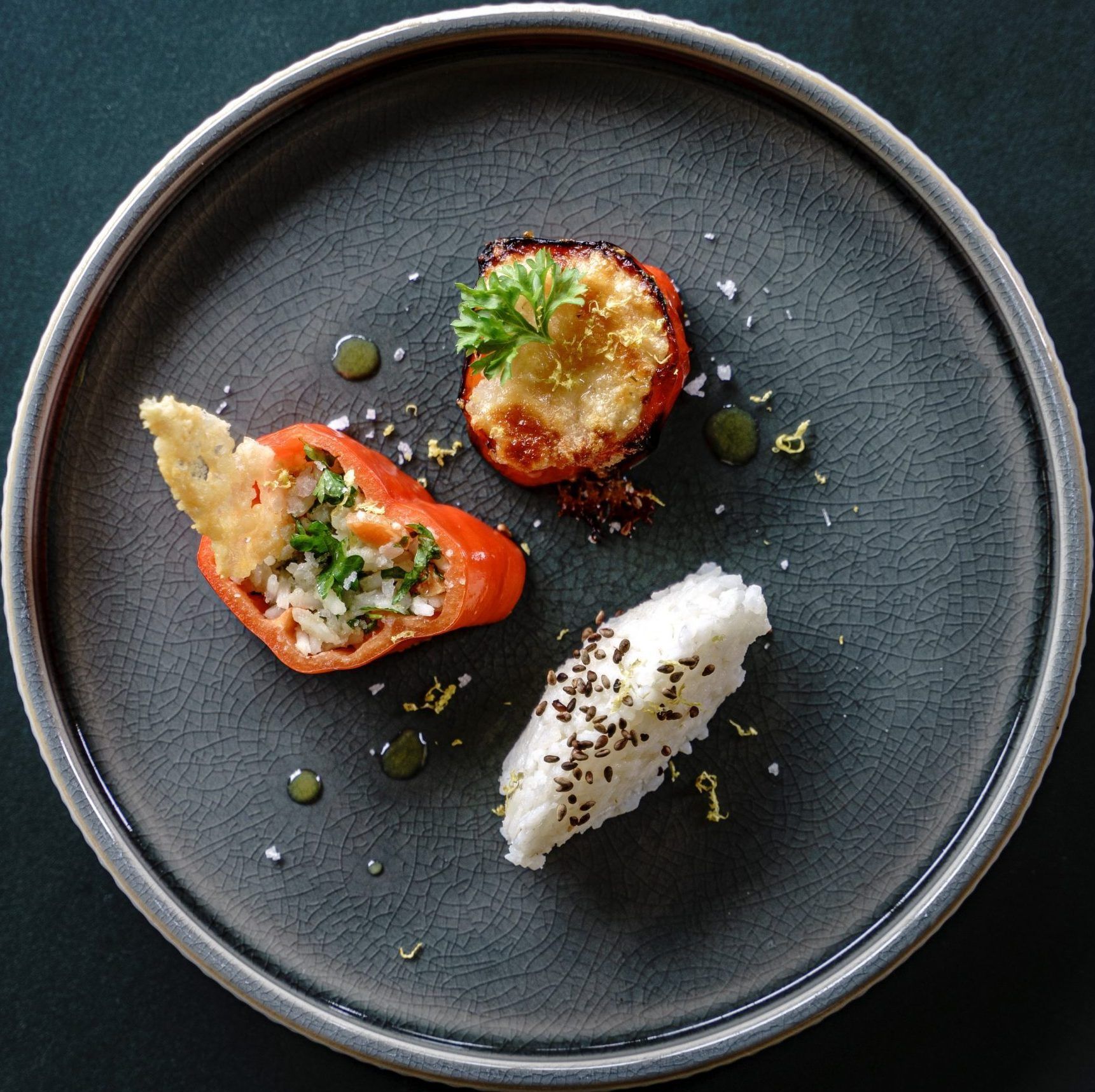 chokolade for en rund smag. - Server med ris, vegansk ost og grøntsager.