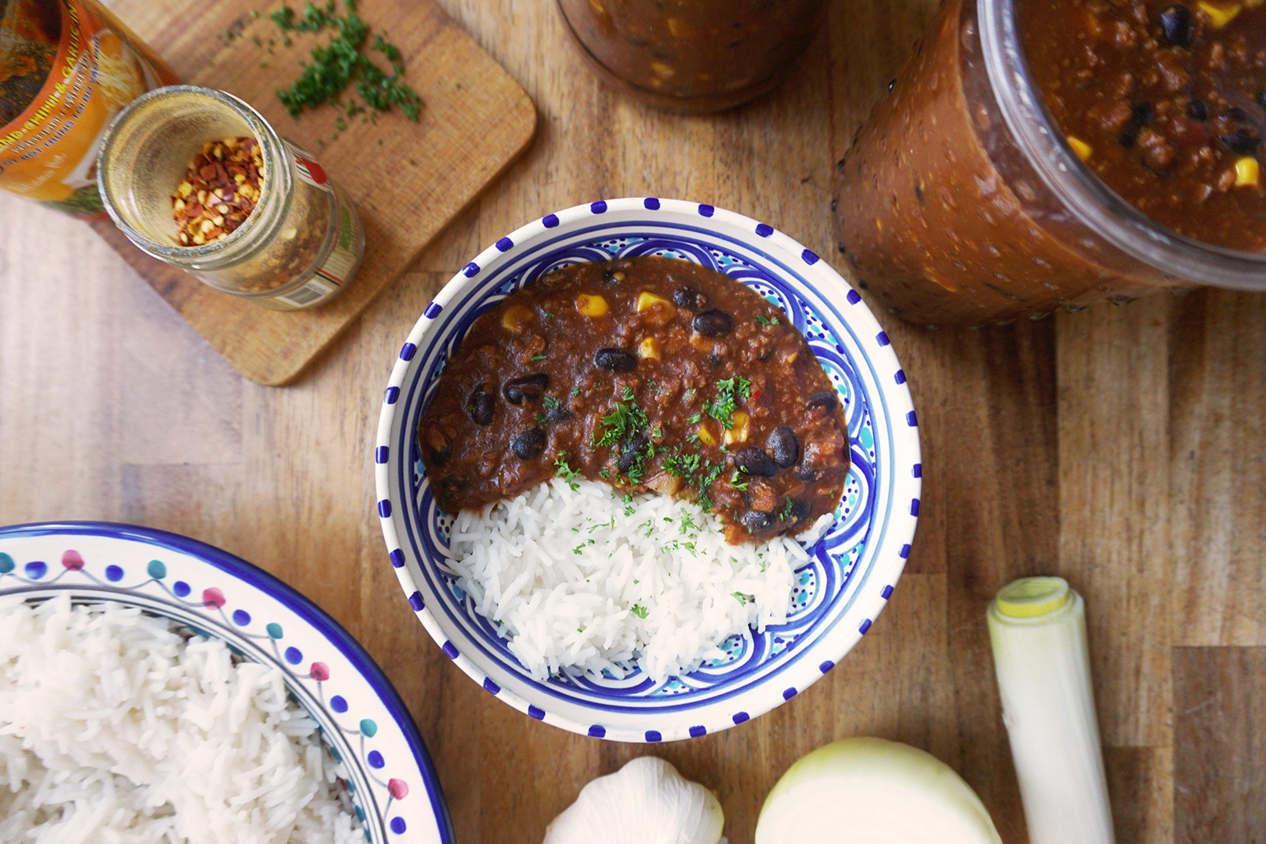 Vegansk chili sin carne med knækrisblanding