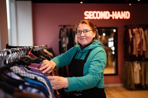 © Folkekirkens Nødhjælp Kvinde, der handler i en af Folkekirkens Nødhjælps genbrugsbutikker