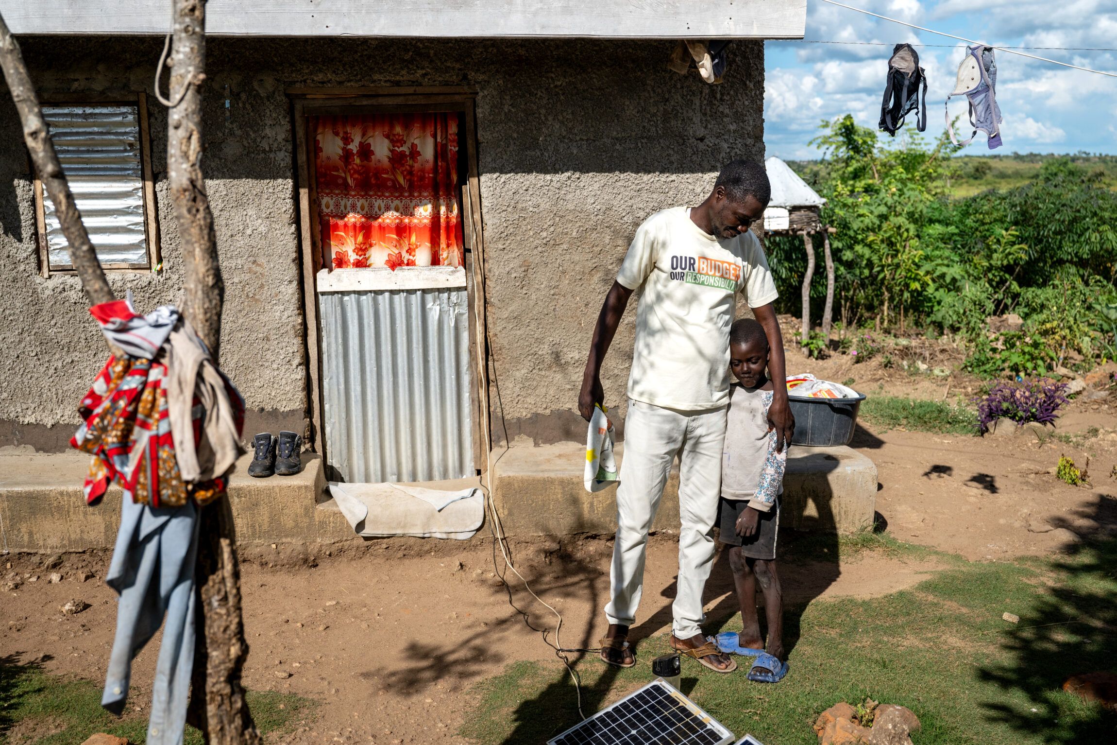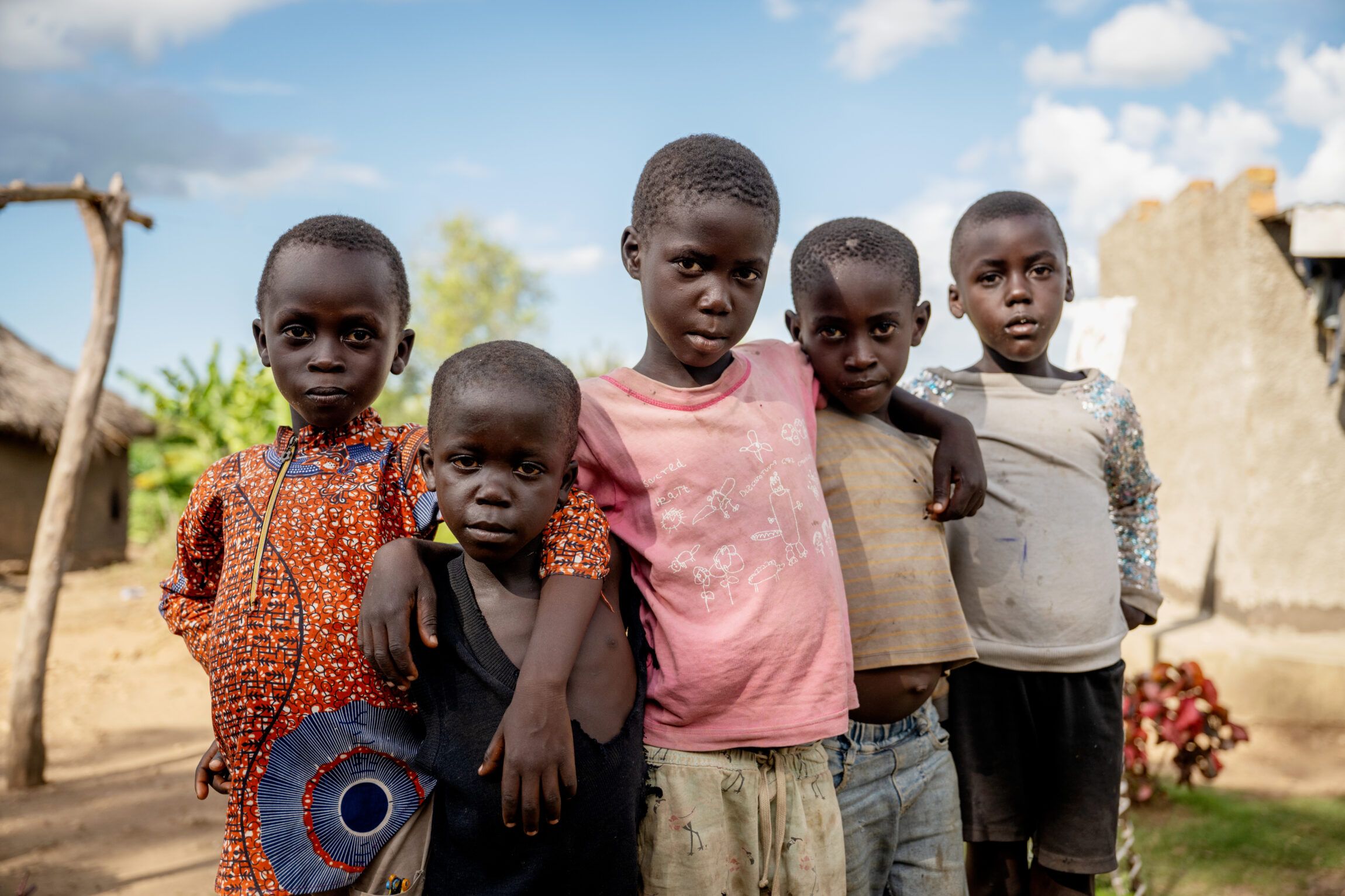 Brødrene Steven på 8 år (i midten) og Samuel på 5 år (yderst til højre) bor i Village 10, Zone 3 i Bidibidi Refugee Settlement sammen med deres forældre, Josephine (30) og Alex (34), og to andre søskende, Elizabeth (12) og Norbert (5 måneder).