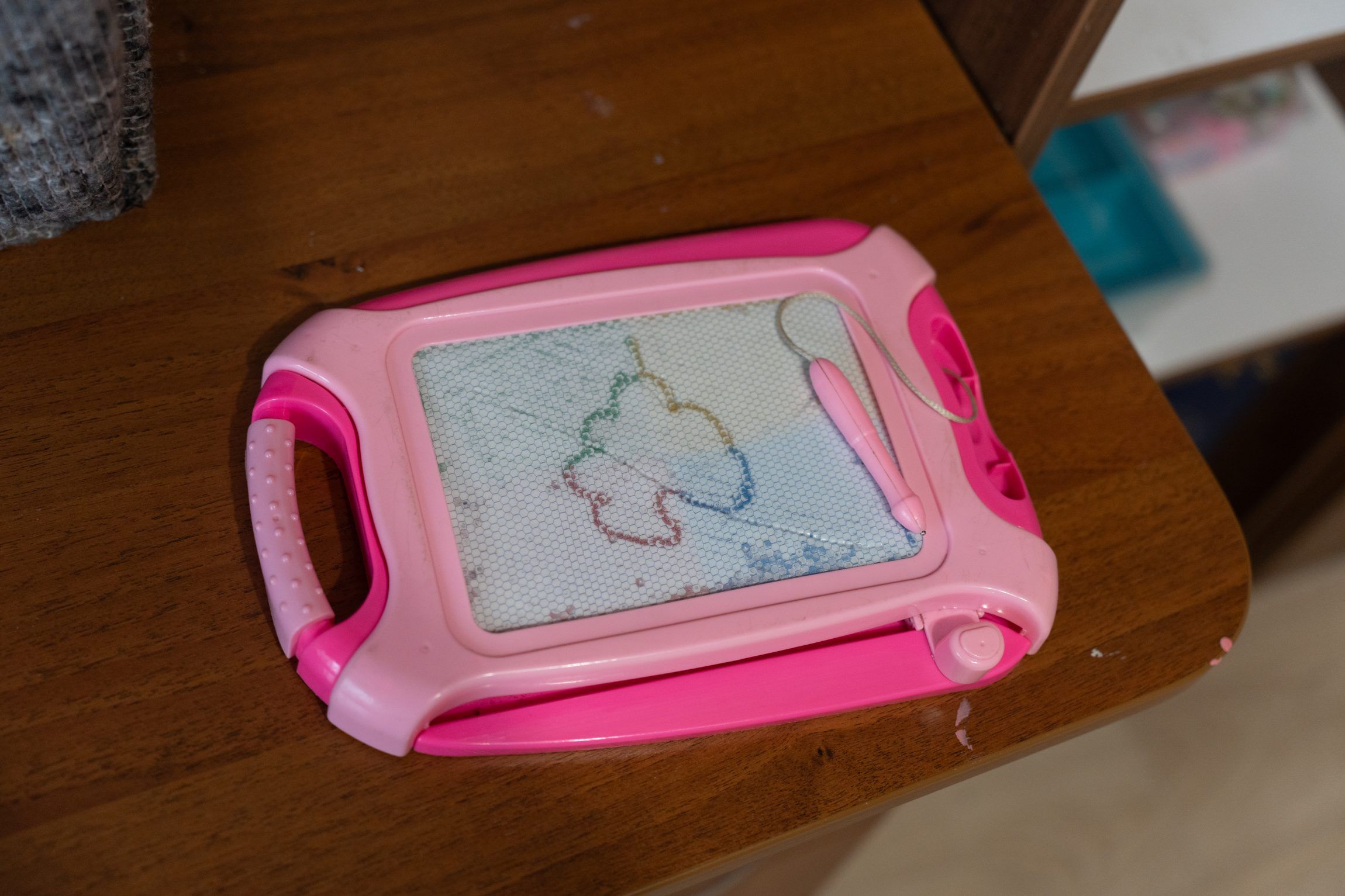 Mira viser stolt sine tegninger frem. Der er flere hundrede af dem på papir, og så har hun en lille magnetisk tegnetavle, der er blevet brugt til at tegne utallige farverige blomster og dyr.