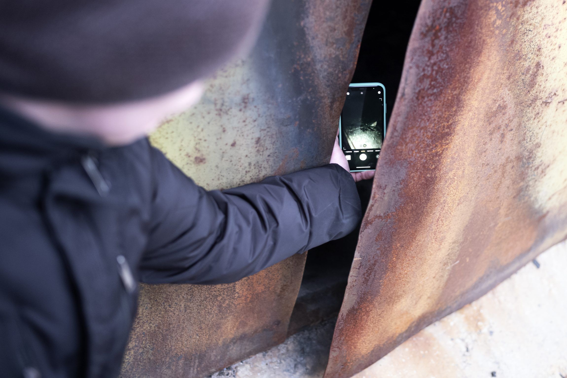Skuret, hvor Vadims far blev fundet, er i dag låst af. Han kan dog lige åbne døren på klem for at kigge ind. Foto: Sofia Busk.