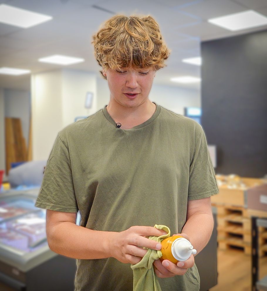 Jens er akkurat mødt på arbejde, da han spotter en beskidt tube sennep. Han svinger kluden i sin hånd frem og tilbage over det bøjelige plastik og placerer det rene resultat tilbage på hylden.