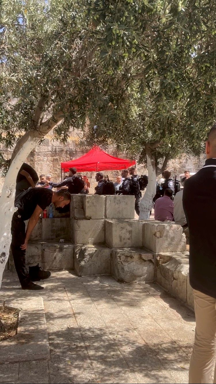 Hver fredag møder israelske soldater og politi talstærkt op ved alle indgange til Al-Aqsa moskéen – og de står også parat ved portene til den gamle bydel, hvor man finder indgangene til moskéen. Omgivelserne omkring bønnen er derfor ekstremt militariseret. Den palæstinensiske menneskemængdes første møde på vej til bønnen var i dag 14 soldater.