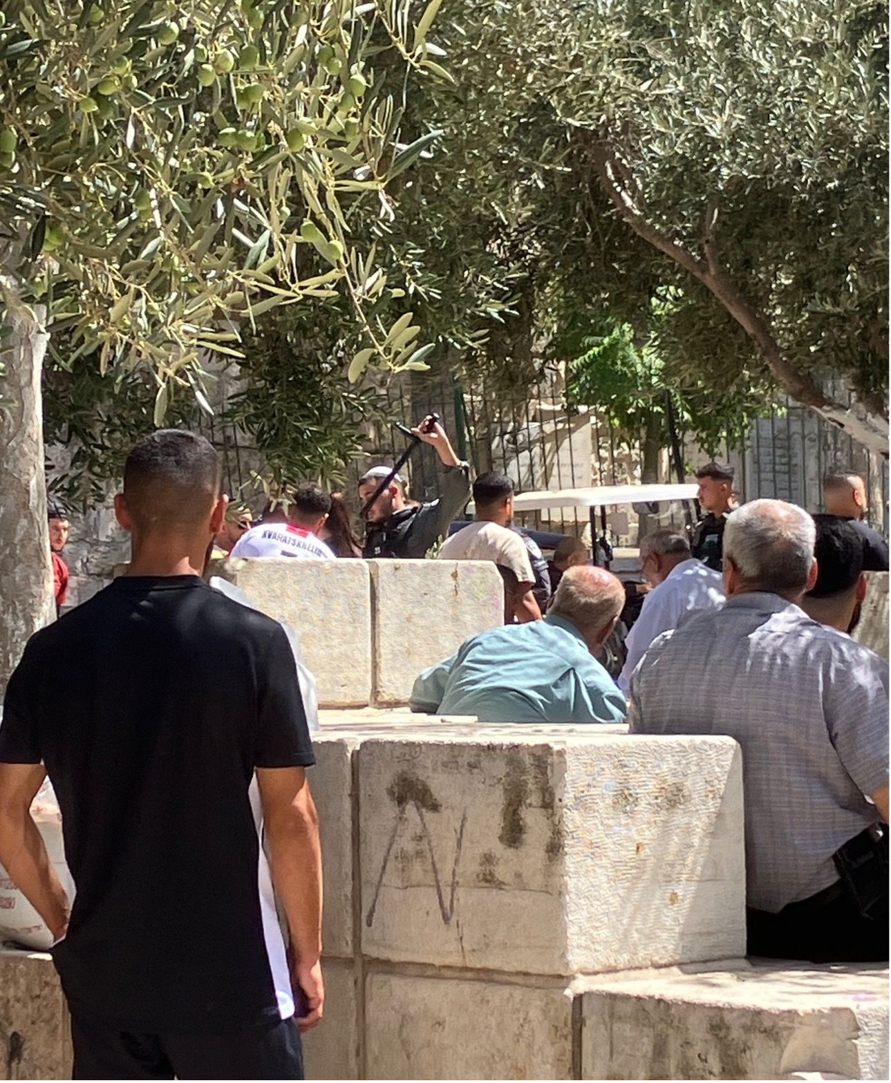 Denne summen afbrydes af sporadiske råb affødt af voldsepisoder, hvor de israelske soldater anvender fysisk vold til at skubbe palæstinensere væk fra indgangen. Hver fredag er volden ekstrem på denne plads, og dette var også tydeligt i dag.