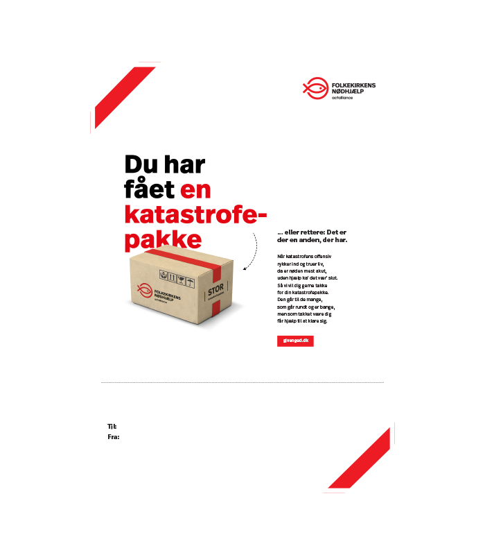 Dit gavekøb fungerer som en donation til Folkekirkens Nødhjælps katastrofearbejde i verdens brændpunkter. Med katastrofepakken er du med til at sikre, at udsatte familier får livsnødvendig hjælp til at overleve.