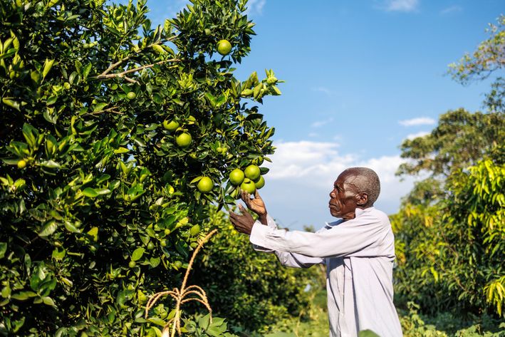 Stanley Aremu på 69 år har med hjælp fra Folkekirkens Nødhjælp plantet frugttræer med bananer, appelsiner, papaya og dyrker majs og bønner, som sikrer mad på bordet og en fast indkomst til hans familie. Giv et træ til familier som Stanleys.