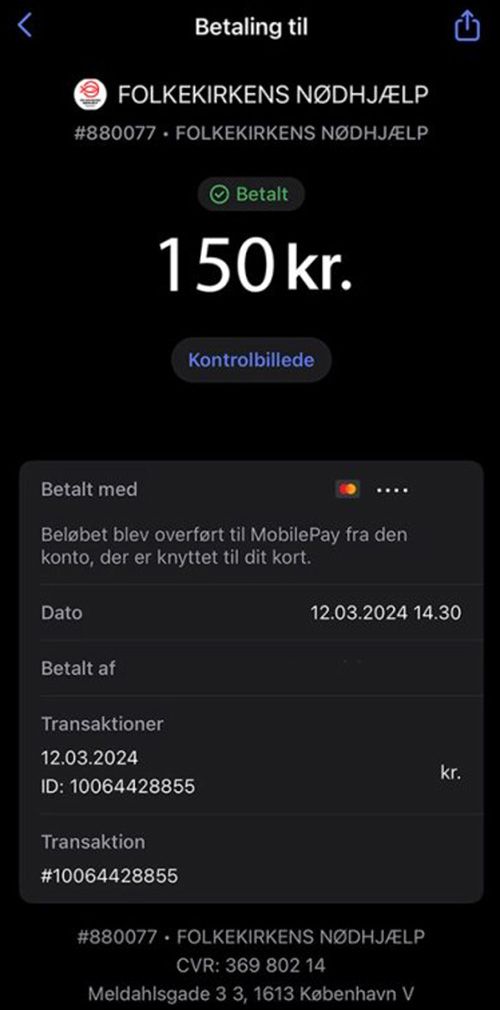 Dernæst skal du finde din donation i MobilePay app’en. Klik ind under ”Aktiviteter” og klik ind på din donation, så din kvittering folder sig ud, og tag et billede af hele din kvittering – inklusive transaktions-id’et.